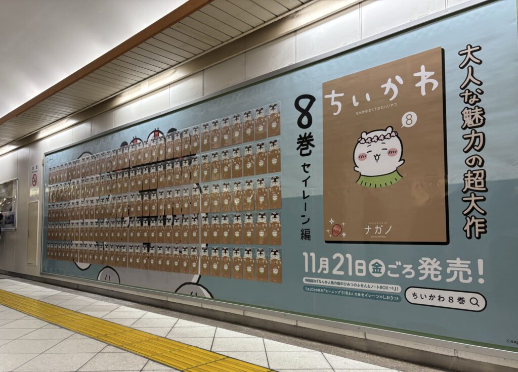 【池袋駅に登場!】ちいかわコミックス8巻の発売予告広告が出現|ピールオフ企画も実施